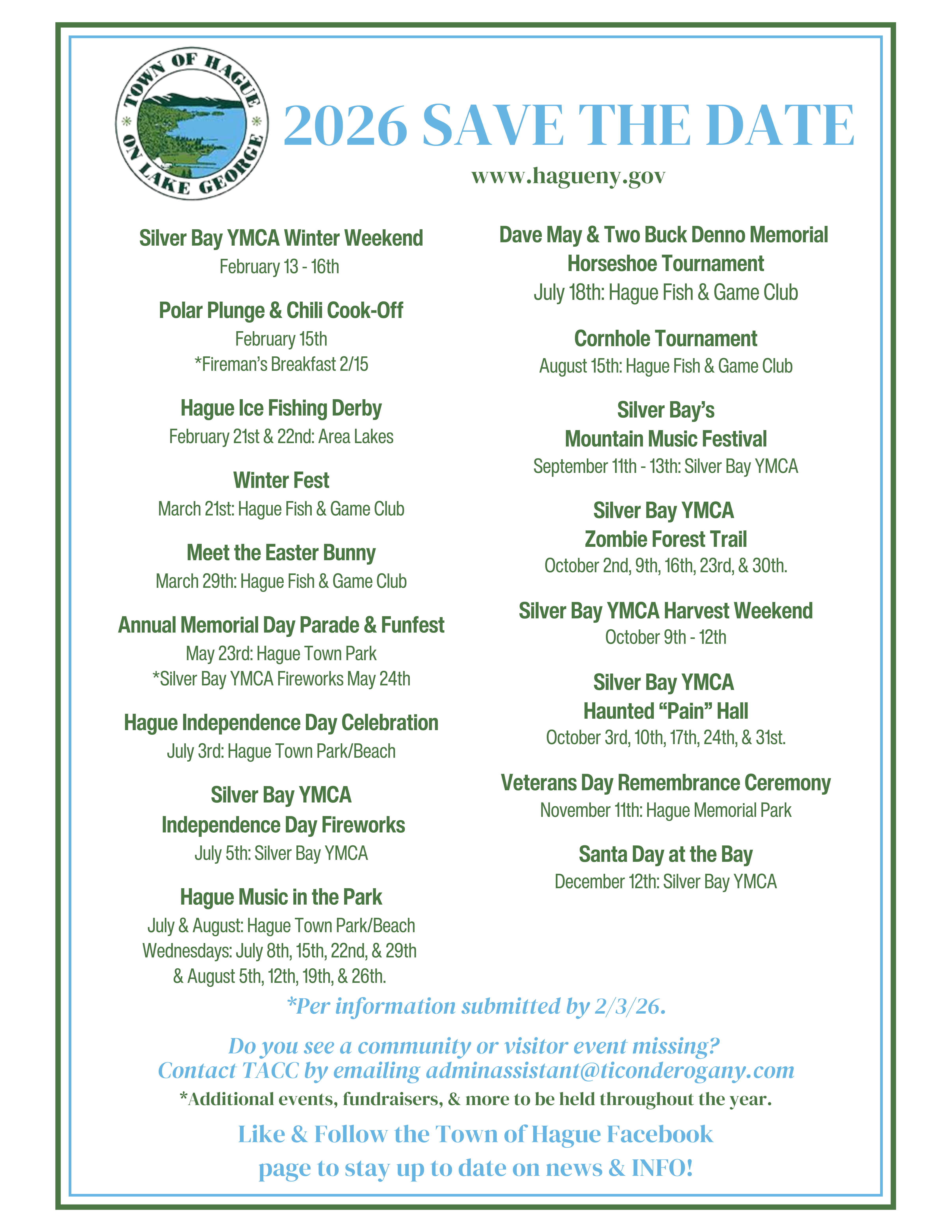 The Town of Hague has made every effort to ensure that information posted to this website is correct at the time of its posting. However, meeting dates, times and places are always subject to change; it is recommended that you contact a local official or the representative of any event posted for confirmation before attending. The Town of Hague makes no claims, representations, guarantees or warranties as to quality, content, accuracy, completeness, currency or suitability of the information, text, graphics, photos, links and other items provided via this website. The Town of Hague does not assume any responsibility for content found on websites to which it links. These websites operate under the auspices and at the directions of their respective owners.